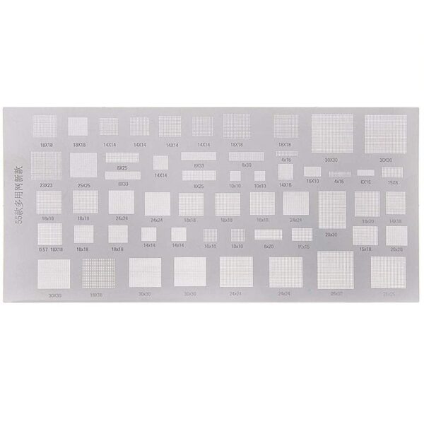 این شابلون فلزی مورد استفاده تعمیرکاران جهت عملیات پیش مونتاژ آی سی های BGA و ریبال آنها که بیشتر بر روی گوشی های موبایل و تبلت و تراشه های دستگاه های ماینر میباشند مورد استفاده قرار می گیرد. البته بعضی از آی سی ها شابلونی برایشان وجود ندارد و یا حتی تهیه و ساختن آن هم برایمان ممکن است سخت باشد و در این حالت استفاده از شابلون همه کاره راهکار مناسبی برای این کار می باشد.